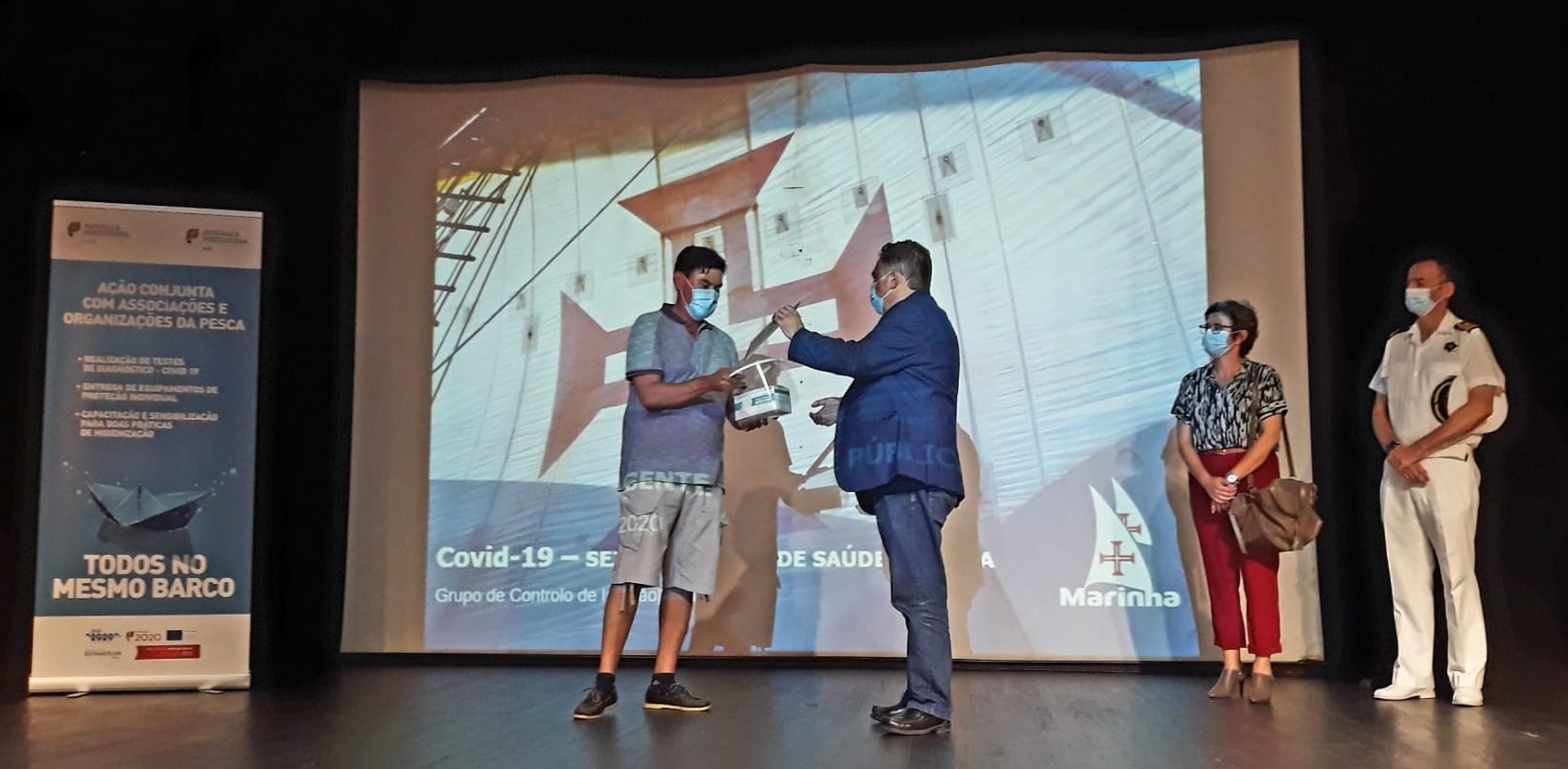 No início da sessão a DGRM procedeu à entrega de equipamentos de proteção individual destinados aos associados da Organização de Produtores Centro Litoral, designadamente de 4300 máscaras e 86 viseiras, tendo também sido distribuído um folheto com as informações essenciais sobre os sintomas associados à doença, cuidados a ter e utilização adequada da máscara.