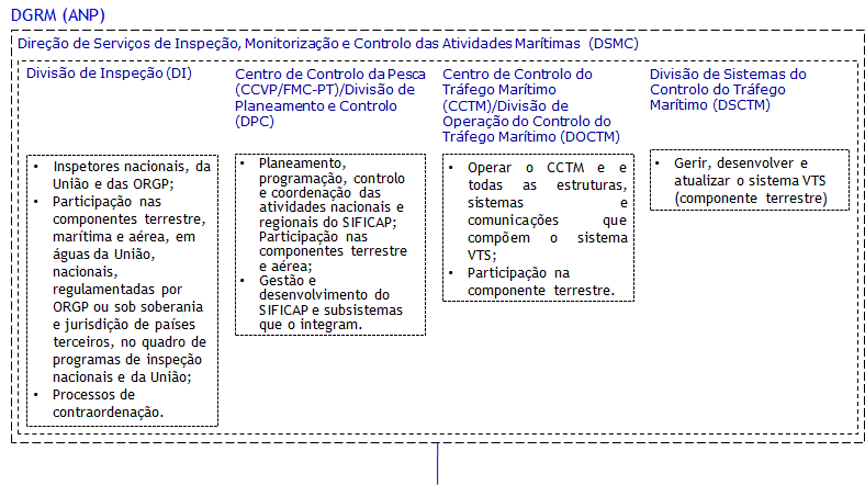 Para o exercício das competências de ANP, a DGRM está dotada de uma estrutura orgânica própria, a Direção de Serviços de Inspeção, Monitorização e Controlo das Atividades Marítimas (DSMC), à qual compete, nos termos do artigo 5.º da Portaria n.º 394/2012, de 29 de novembro, nomeadamente:
