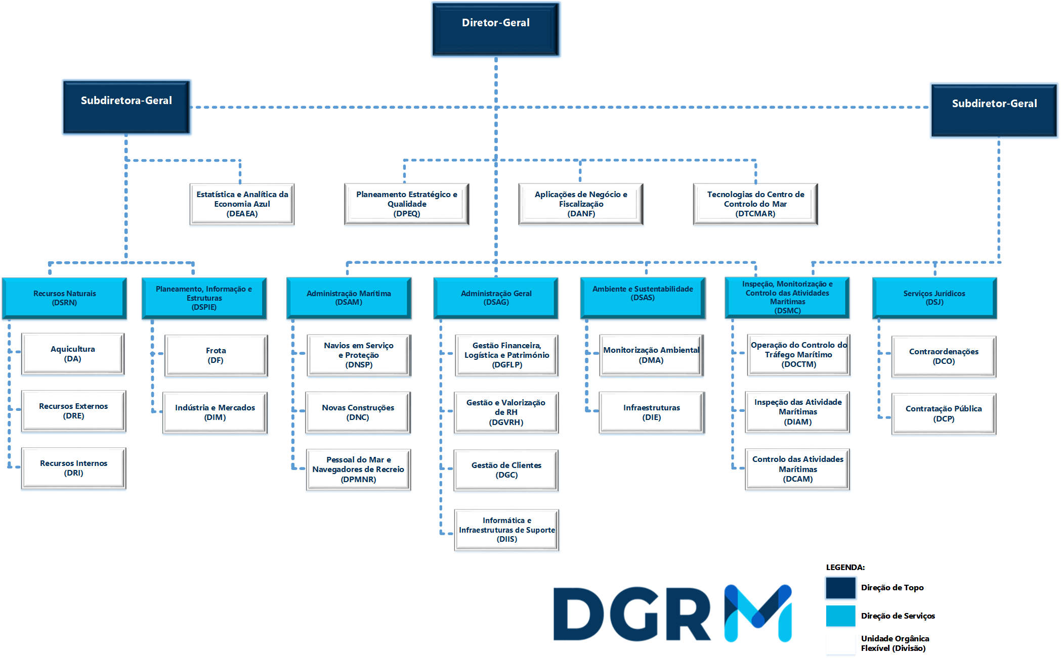 O Organograma da DGRM é constituído por sete Direções verticais especializadas por área de atuação e competências especificas, quatro Divisões autónomas de apoio direto à Direção Superior e de atuação transversal a todas as unidades.